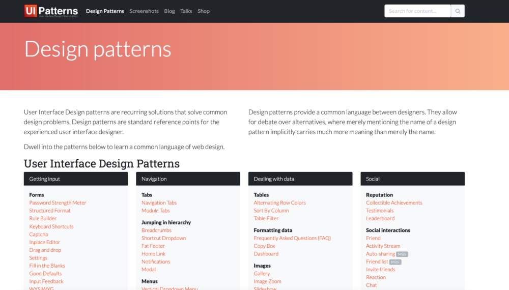No UI Patterns você facilmente encontra padrões de interfaces realmente úteis. Lá também têm vários artigos interessantes sobre padrões de design de interface do usuário que podem ajudar a aflorar a sua criatividade ao abordar o uso de padrões em seus designs.